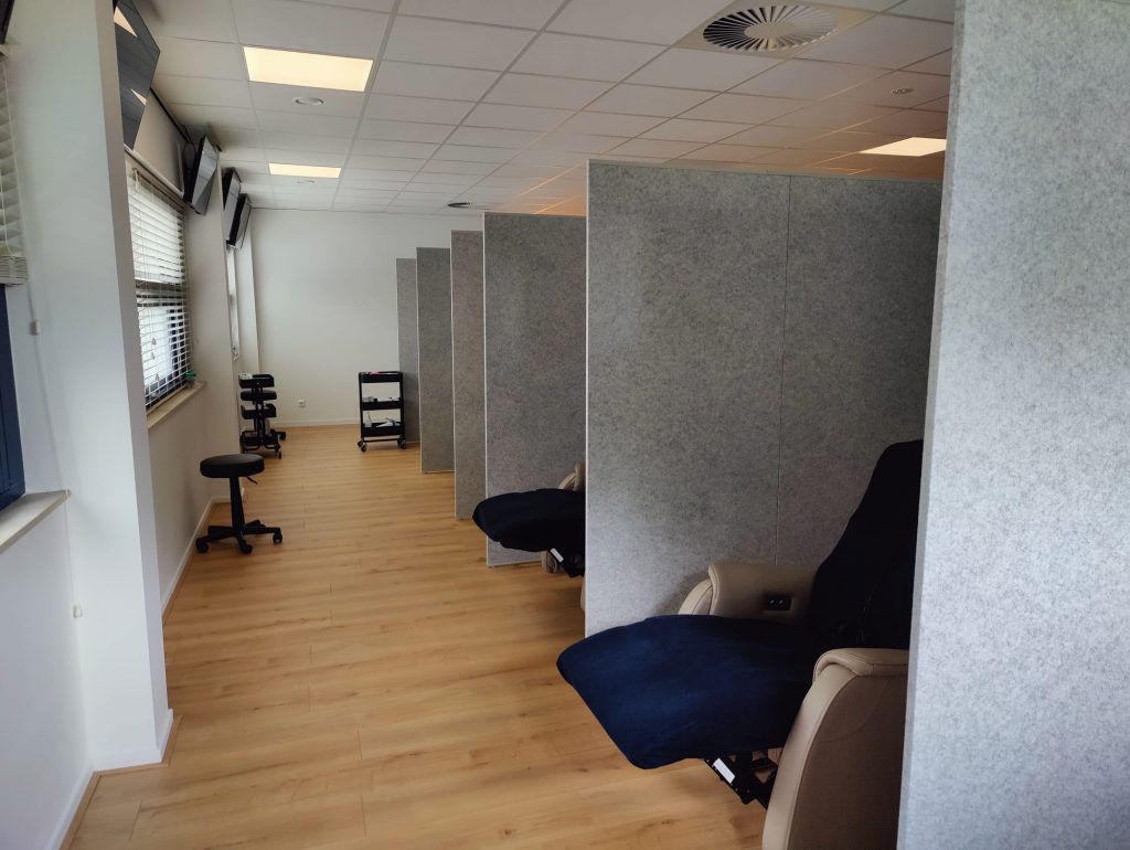 Onze praktijk beschikt over comfortabele relaxzetels, gescheiden door wanden voor maximale privacy, tegelijkertijd kun je genieten van het natuurlijke licht dat door onze grote ramen de ruimte binnenstroomt. En voor extra comfort: elke relaxzetel is elektrisch verstelbaar en voorzien van verwarming, zodat je optimaal kunt ontspannen tijdens je behandeling.